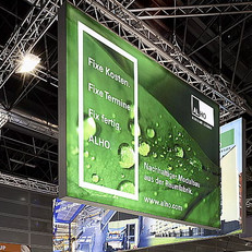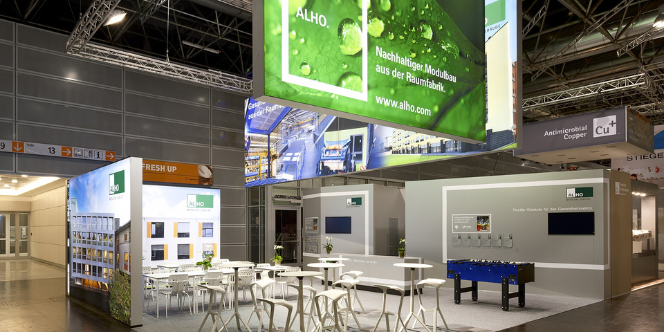 ALHO auf der Medica in Düsseldorf. Luftige Werbebanner aus Stoff, statt schwere Wände, und ultramoderne Möbel, die den Geist des Modulbau-Unternehmens spiegeln. Planung, Realisation.