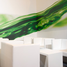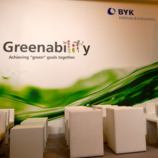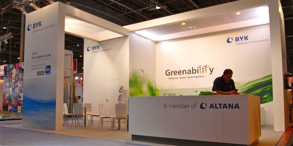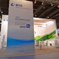 Klares Konzept mit cooler Grafik. BYK auf der wichtigsten Chemiemesse in Paris. Der Messestand wirkt durch die offene Gestaltung größer als er ist, und kann sich im Umfeld der Halle hervorragend behaupten. Entwurf, Planung, Realisation.